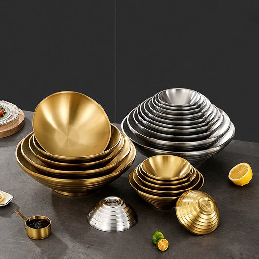 Round Stainless Steel Double Wall Bowl Insulated Ramen Fruit Soup Salad Bowls Kitchen Tableware Non-slip Bottom Food Container